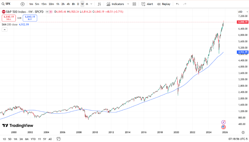 - A 39% gap is far above typical ranges. Historically, the S&P 500 has rarely traded more than 20–25% above its 200-week average for sustained periods.