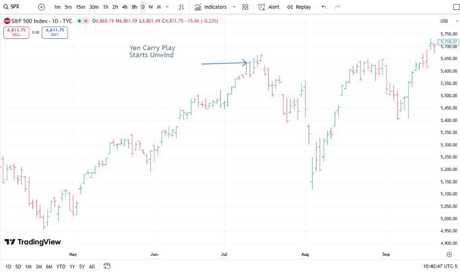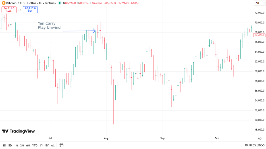 The drop in the dollar was not the only market to get slammed by the partial unwind of the yen carry play. Have a look at the chart in Bitcoin during this period. It crashed by 30% in a dizzying fall.