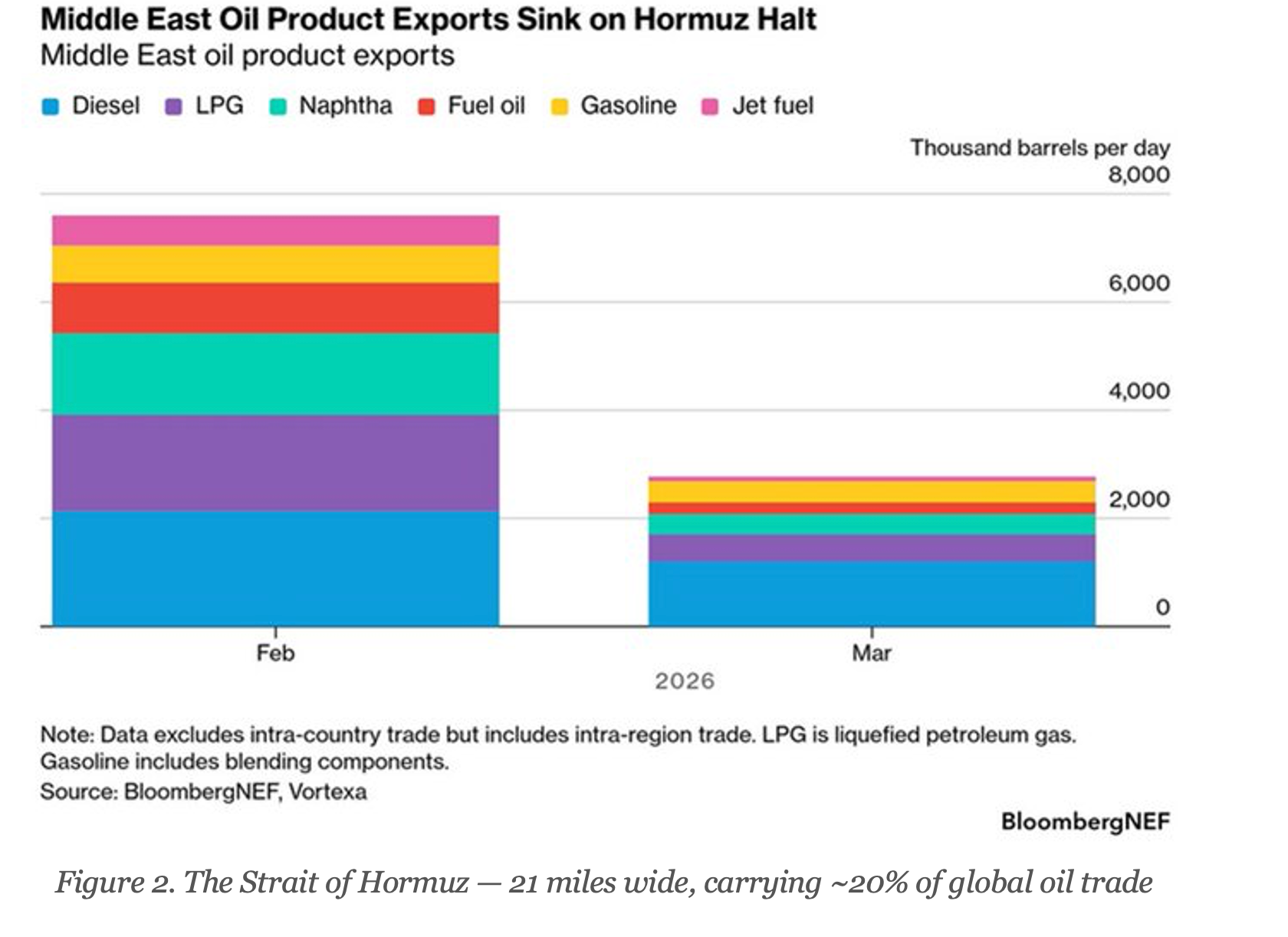 European refiners are among the most exposed. After redirecting away from Russian crude, they had grown reliant on Middle East refined products. A –63% drop layered on top of tariff-driven demand destruction creates simultaneous supply and demand shocks — the worst possible combination for price stability.