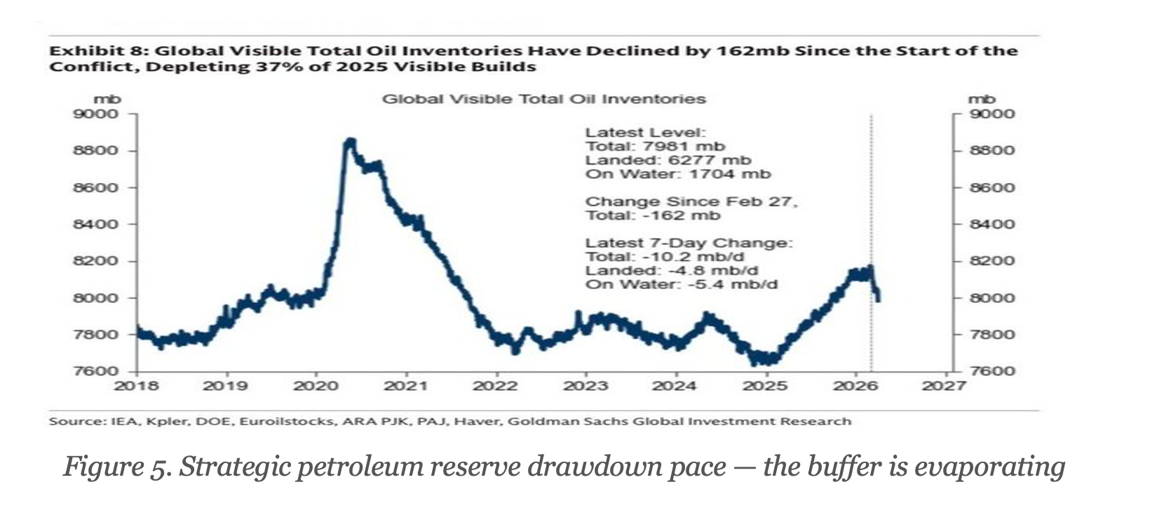 March data confirms the scale: Crude exports fell ~60%–70% depending on the dataset, product exports fell even more sharply— the largest recorded drop in history. For perspective, the entire 1973 Arab oil embargo cut roughly 4.4 million bpd. This crisis is already worse by volume. And unlike 1973, there is limited spare capacity sitting in Texas and elsewhere.