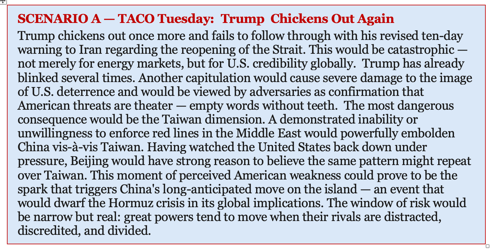 I have to admit that the short-term market action today is immediately puzzling. Trump’s revised warning to Iran ten days ago had a deadline of April 6 at 8pm EDT. The fact that he has shifted yet again the deadline (to April 7) suggests to some that he really has no intention to carry out his repeated threats. Although that might be bullish short term, I don’t see a positive long-term solution unless Iran absolutely caves in the negotiations, and I don’t expect that. The challenge for Trump is that Iran really has him trapped right now. If Trump wavers yet again, then his threats have less and less credibility. This in turn invites an even bigger crisis – a Chinese takeover of Taiwan.