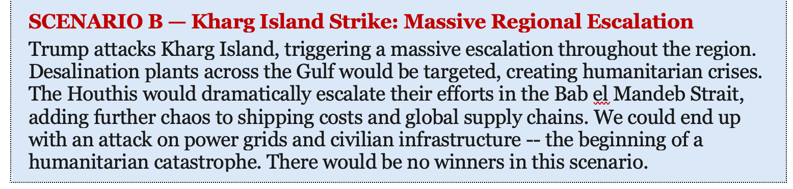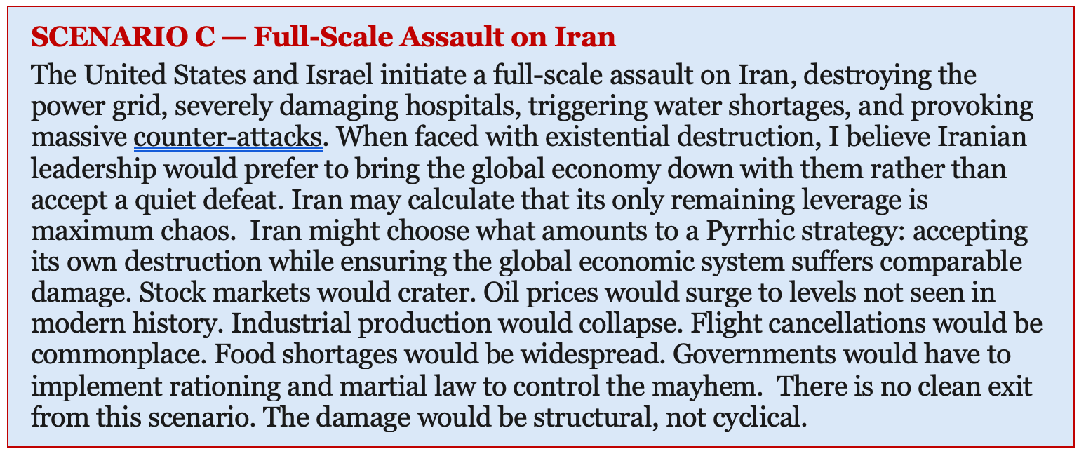 I have no idea how the United States plans to resolve the Iranian crisis, but I see a set of probable outcomes — each with profound implications for financial markets and global stability. These are not exhaustive, but they represent the scenarios that concern me most.