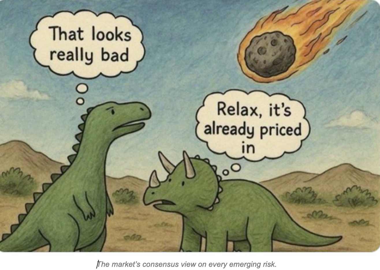 The cartoon below, which has been circulating widely, captures the current market psychology with uncomfortable accuracy. The “priced in” reflex — the instinctive dismissal of any adverse development as already reflected in asset prices — has become the defining feature of the 2028 bull market. It is a posture that conveniently absolves investors of the need to think too carefully about what they are actually buying, at what price, and against what macro backdrop.