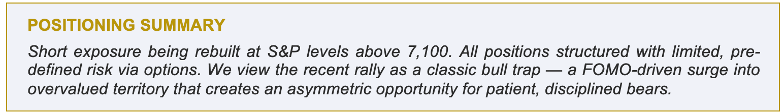 We continue to welcome the market’s generosity. Every day above 7,100 is an opportunity to build more defined-risk downside exposure at levels that history will almost certainly recognize as extreme. We are doing exactly that.