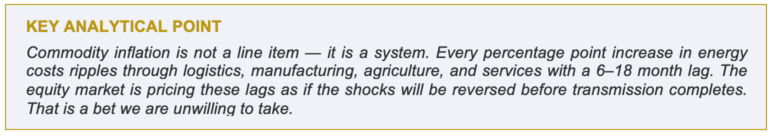 Collectively, this constellation of commodity shocks functions as a broad-based tax on activity — both consumer and corporate — that is not yet fully reflected in corporate earnings forecasts or equity multiples. The lag is real, but it is not infinite.