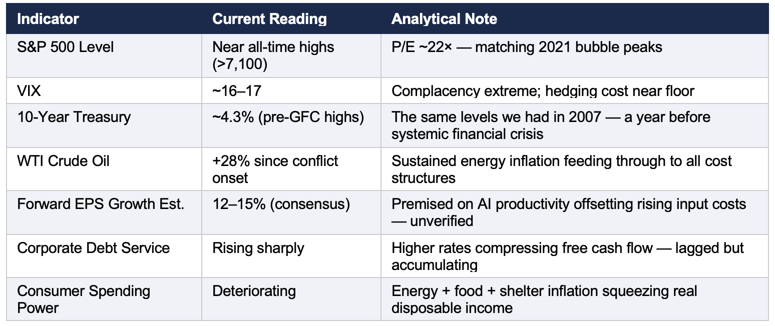 That 2007 parallel is not merely a data point — it is a warning. In mid-2007, with the 10-year yield similarly elevated and equity markets trading near all-time highs, the consensus was constructive, leverage was abundant, and risk was perceived to be well-distributed. Credit problems were ignored, the housing bubble was catastrophically overdone, and twelve months later the financial system had come within hours of a complete seizure. We are not predicting an equivalent systemic event. What we are saying is that history has a habit of rhyming at precisely the moments when markets are most confident that it will not.