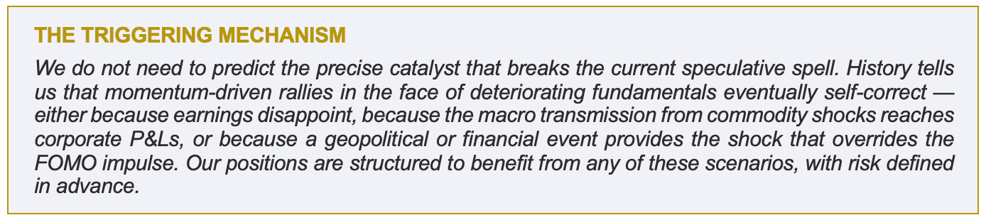 We are now prepared to commit more capital to a structural short thesis — one that is not dependent on a precise timing catalyst, but rather on the inevitable mean reversion between narrative-driven valuations and fundamental economic reality. The commodity shock is real and compounding. The yield environment — at levels not seen since the eve of the Great Financial Crisis — is fundamentally incompatible with current equity multiples. The earnings revisions that will reflect input cost inflation have not yet begun. And the momentum-driven buyers now dominating price discovery are structurally fragile.